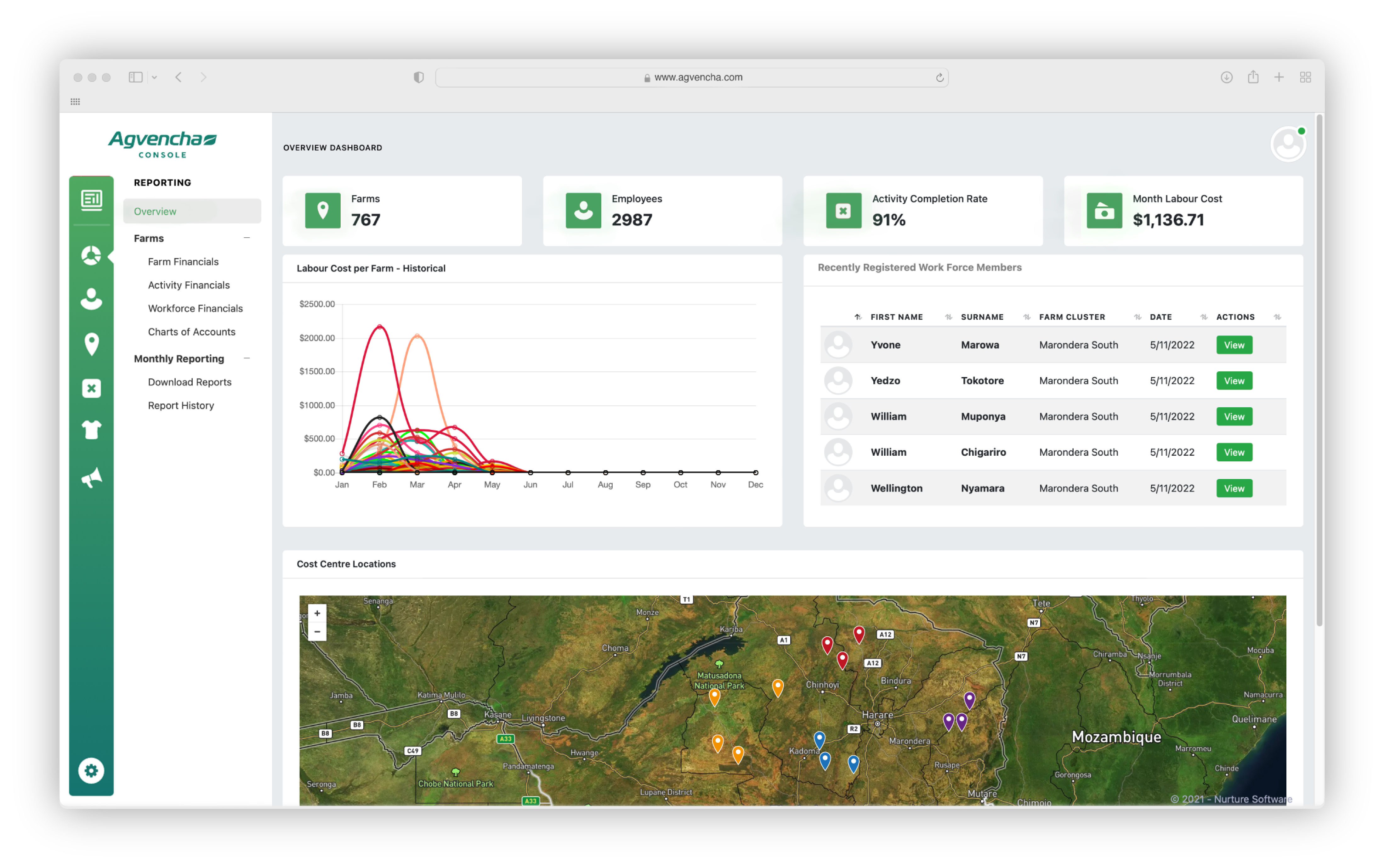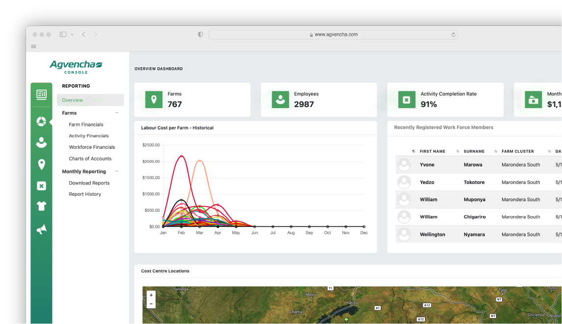 The Agvencha Console gives the business management team an overview of the farming operations. Using the data submitted via the partnering mobile applications, users can get live daily updates on the status of farm inventory, workforce attendance, budget creap and more.